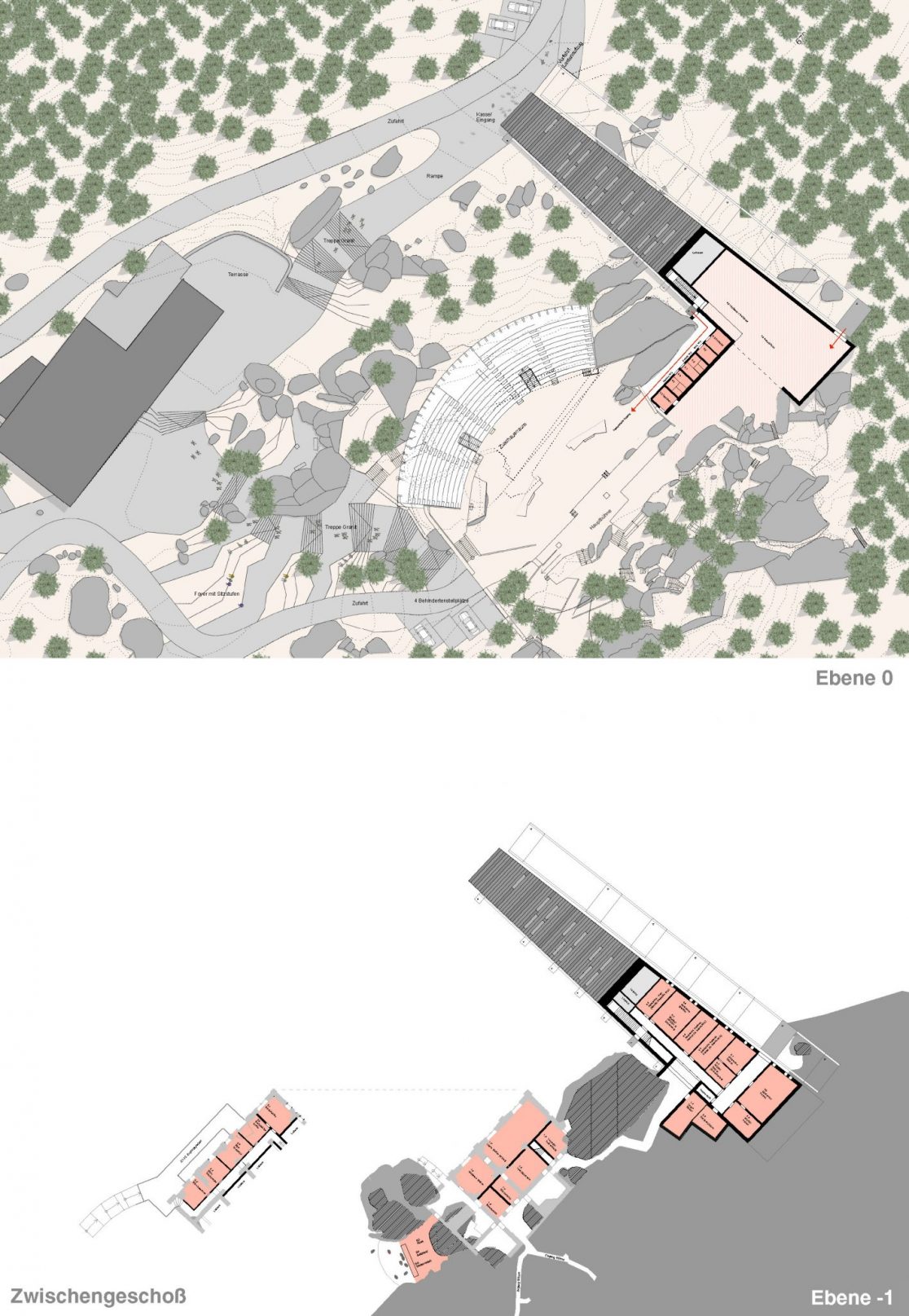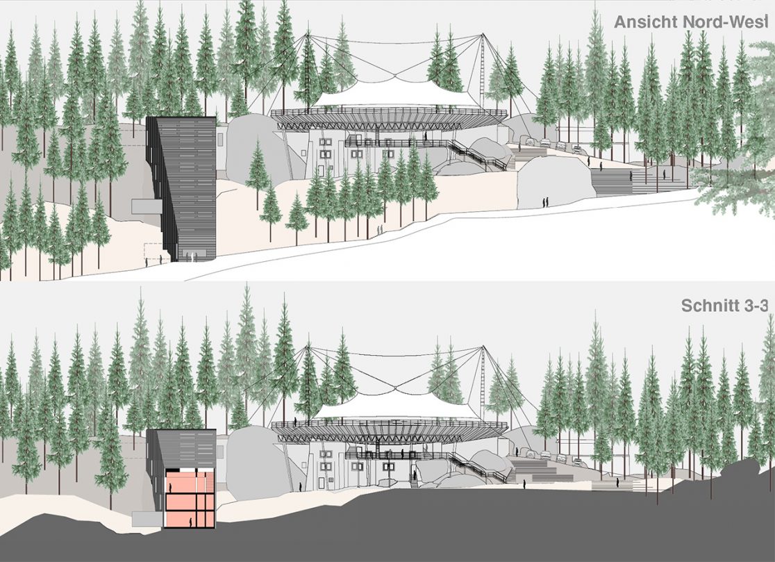 Einmalig ist der Ort durch seine Verbindung von eindrucksvoller Natur und historischer Freilichtbühne mit dem ergänzenden Zeltdach. Die Außenanlagen werden von allen Einbauten befreit und zu einer großzügigen, einladenden Foyeranlage ausgebaut.